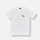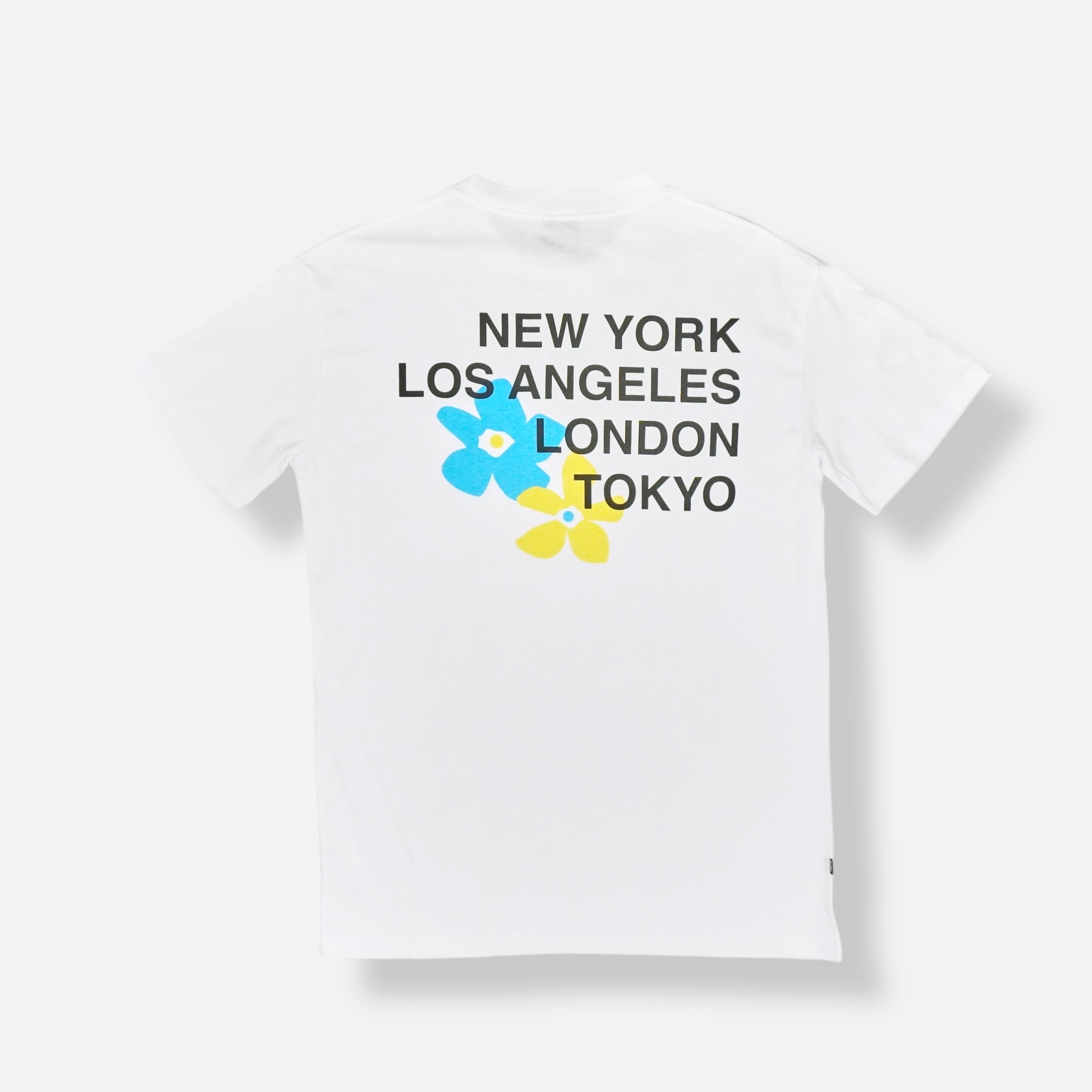 Additional Details: White short-sleeve crewneck tee with small chest logo combining script text and a stylized blue flower; large back print with stacked black city names (NEW YORK, LOS ANGELES, LONDON, TOKYO) and oversized blue and yellow flower graphics. Woven brand tab at lower side seam; lightweight jersey knit.