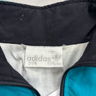 Vintage adidas full-zip track-style jacket with high stand collar, teal and black colour-block panels, white 3-stripe detailing across shoulders and angled stripes on front, embroidered adidas chest logo, zip hand pockets, and elasticated cuffs/hem for a blouson fit; lightweight synthetic feel.