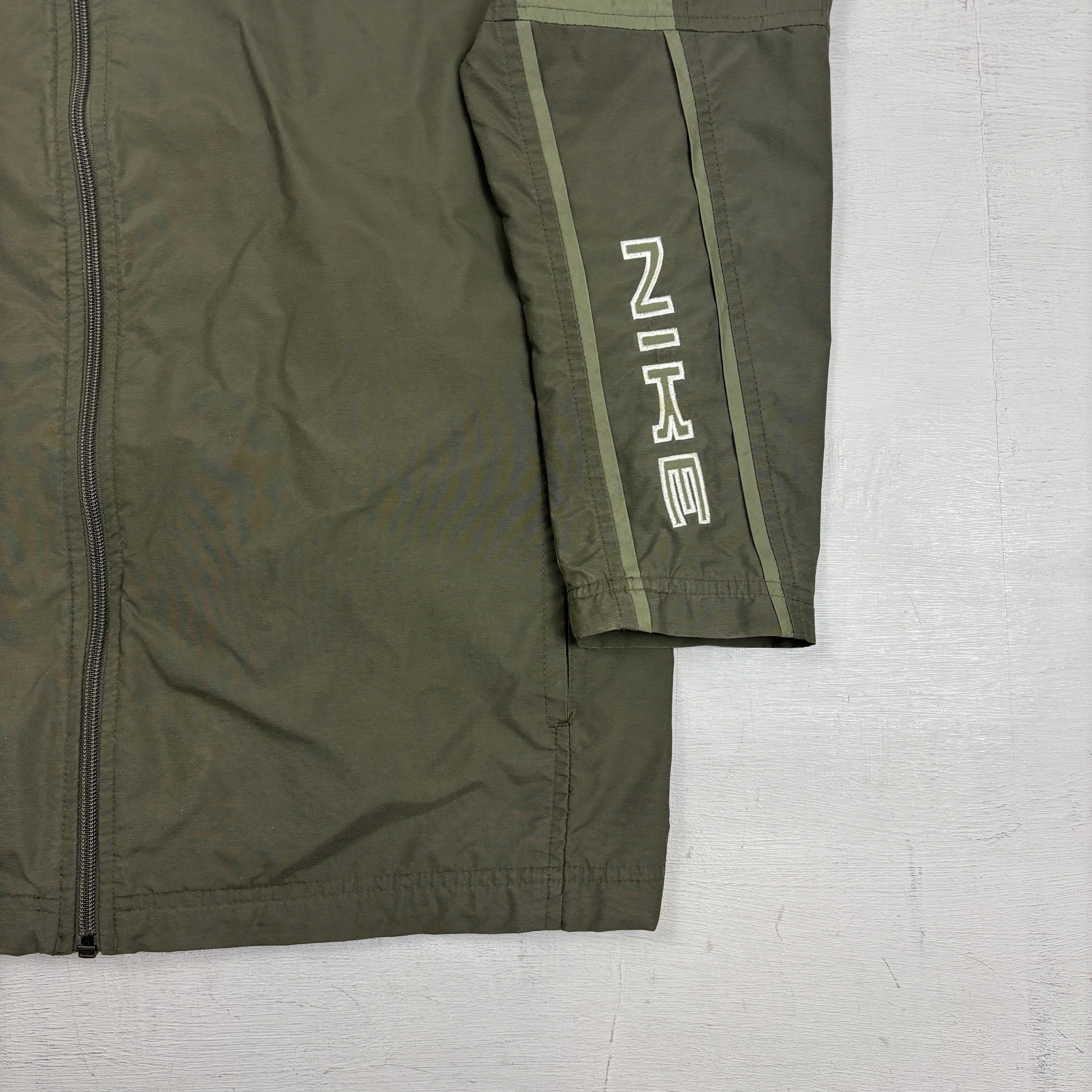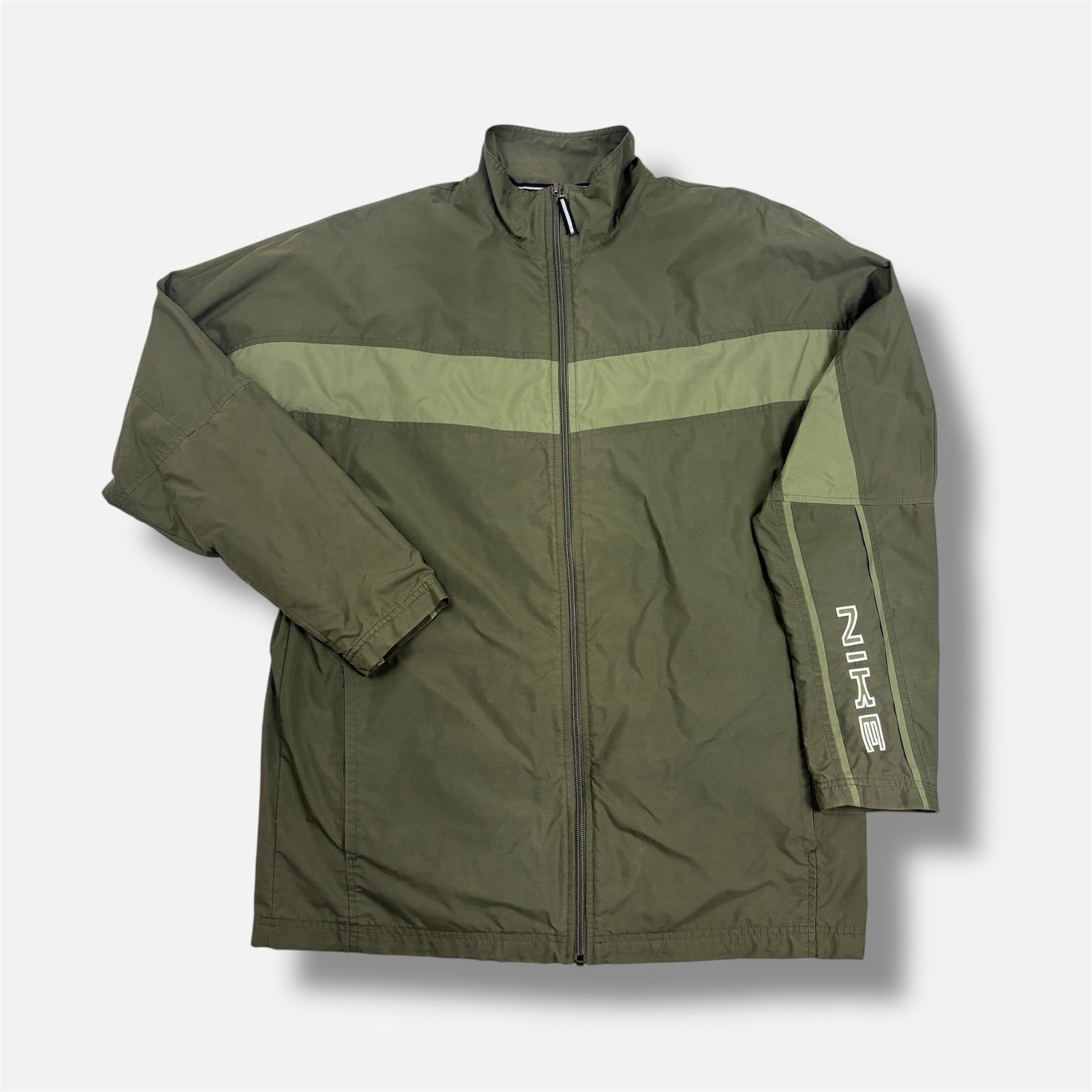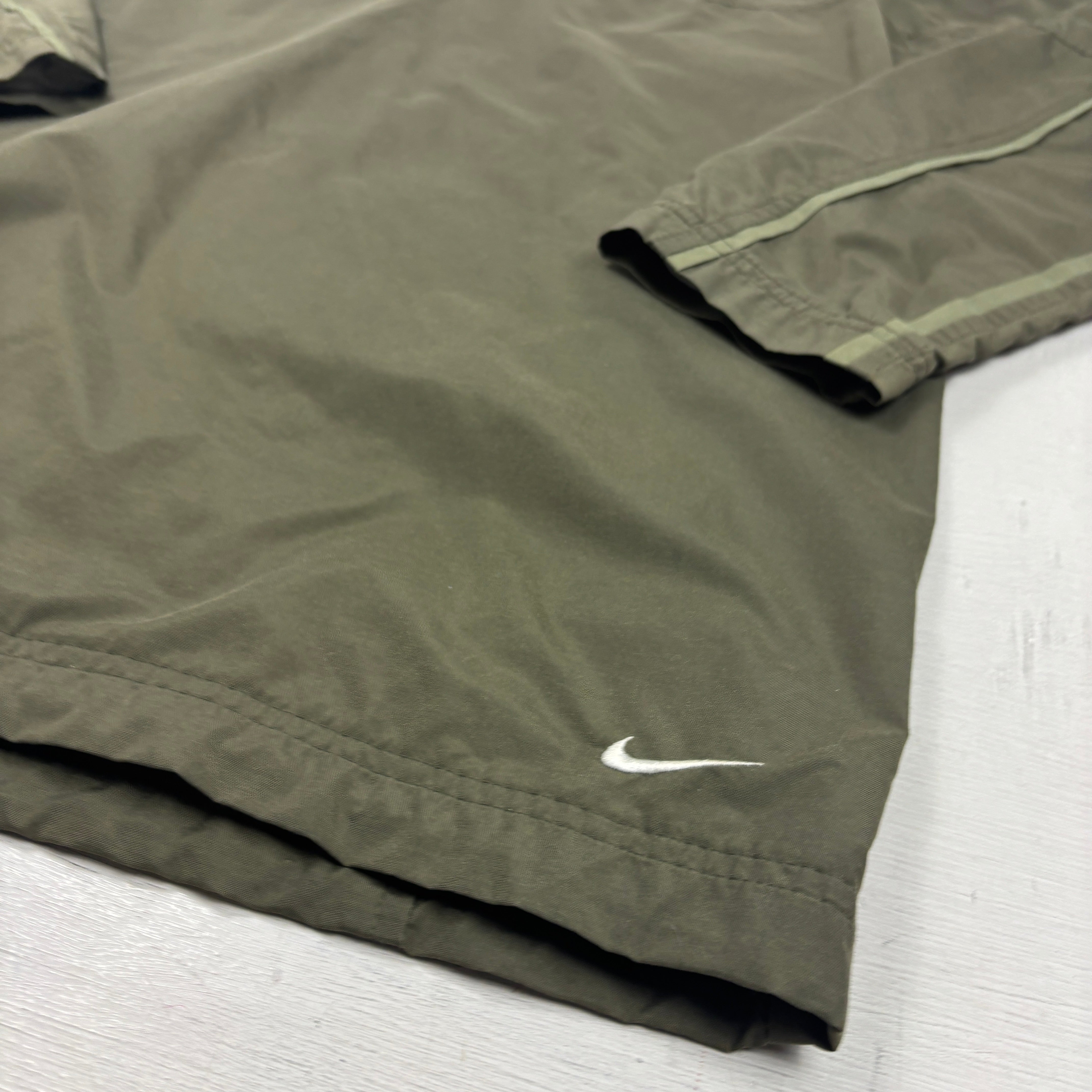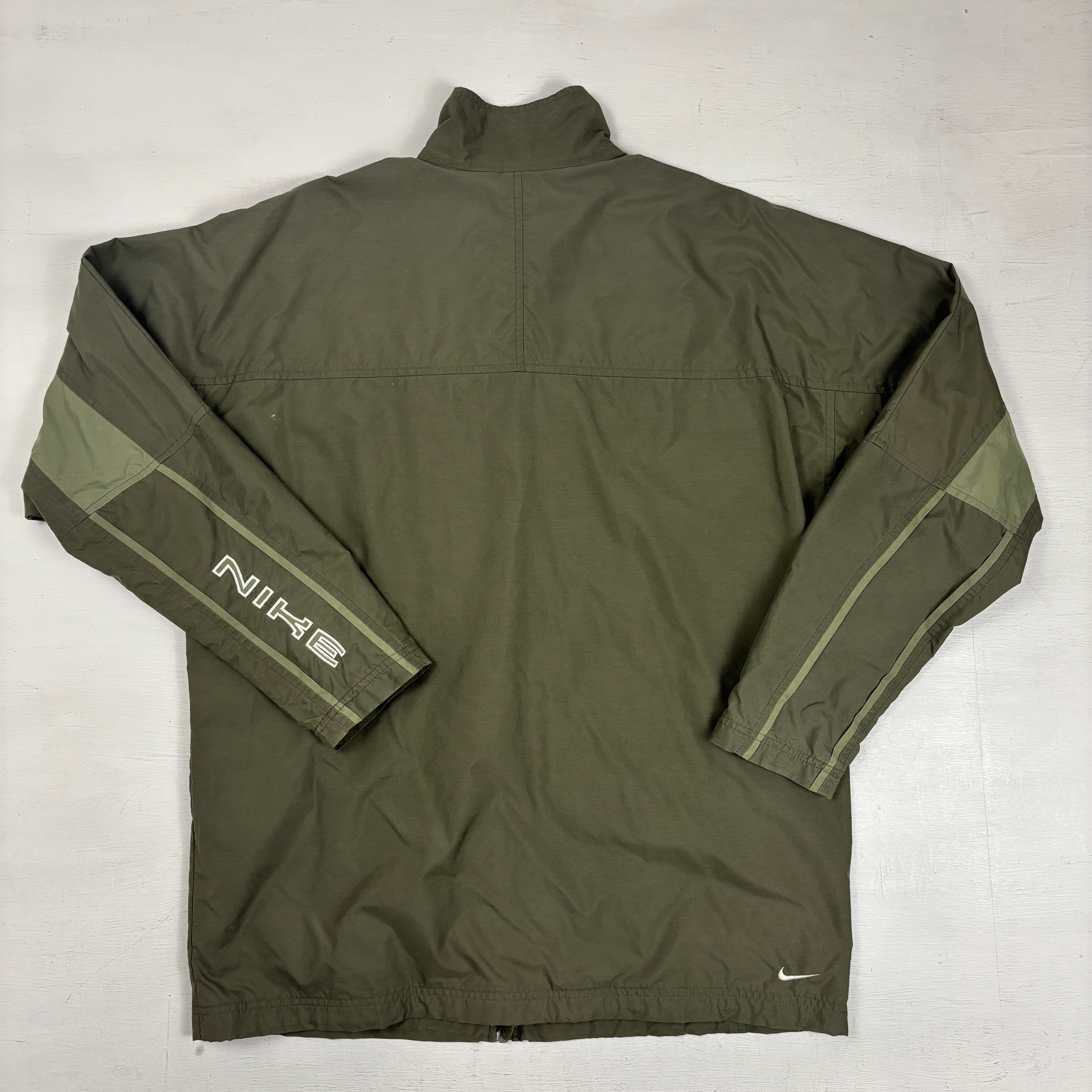 Olive green lightweight Nike zip-up jacket with a stand collar and full-length front zip. Features a pale green horizontal chest stripe on the front, tonal sleeve stripe detailing, large ‘NIKE’ text on one sleeve, and a small embroidered Swoosh near the hem on the back. Minimal, sporty early-2000s style with clean panel seams and straight hem.