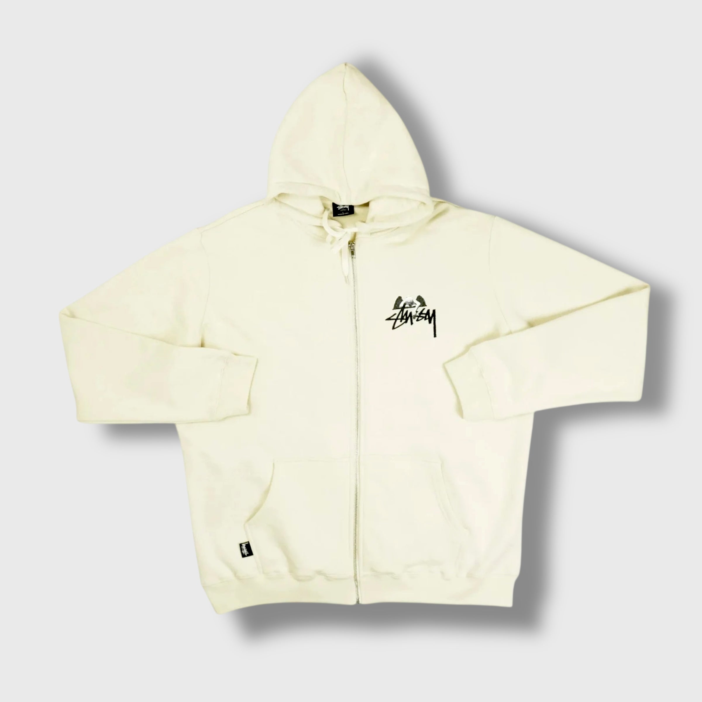 Additional Details: Hoodie with zipper closure, kangaroo pocket, drawstring, front Stüssy logo, and back angel design.
