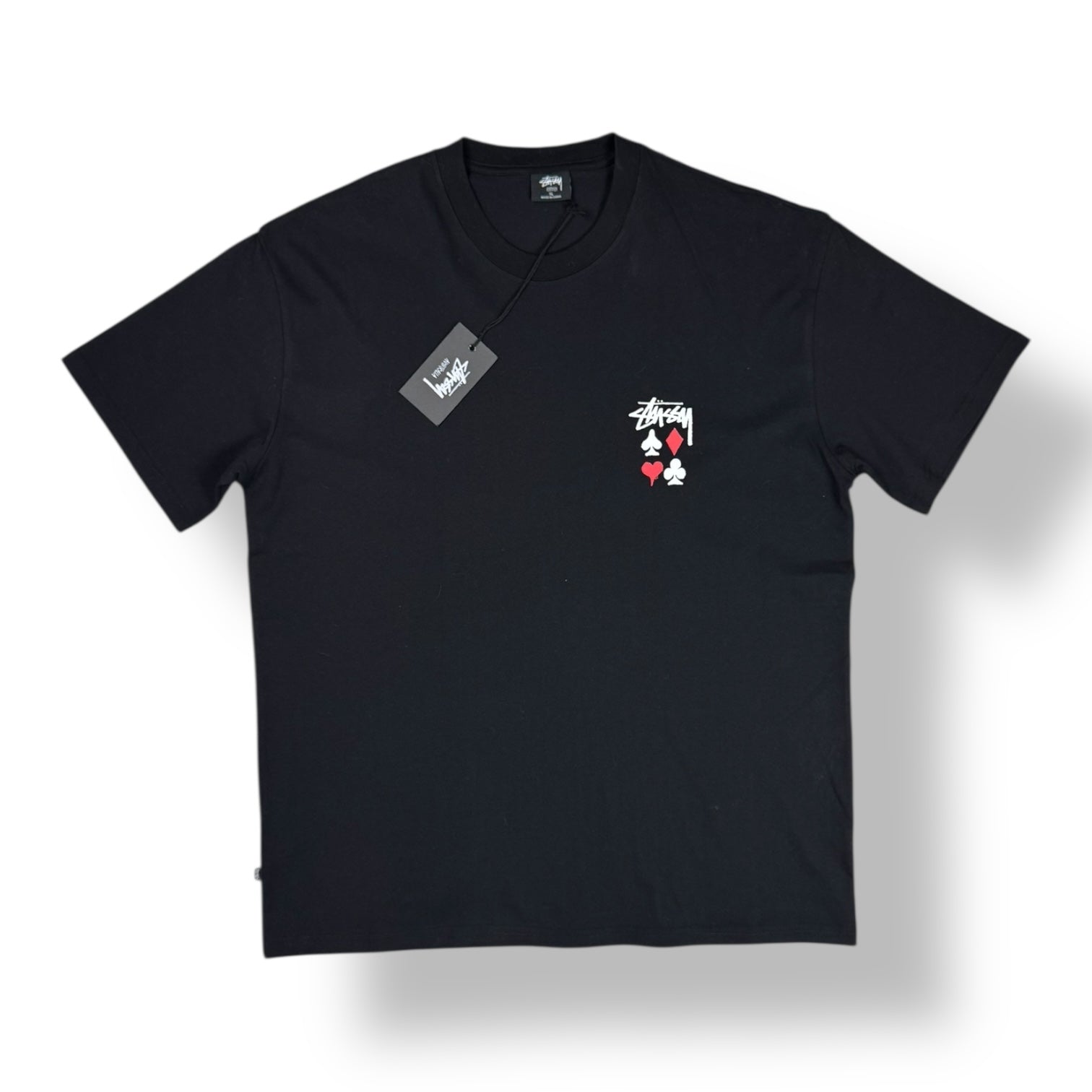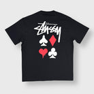Additional Details: Card suits and Stussy logo print, chest and oversized back logo/graphic, soft cotton construction, straight hem.
