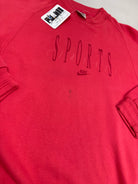 Additional Details: Red vintage sweater with 'SPORTS' text and Nike logo on the chest, ribbed cuffs and hem.