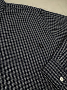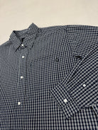 Additional Details: Navy and white gingham pattern, button front closure, long sleeves, pointed collar, buttoned cuffs, embroidered chest logo.