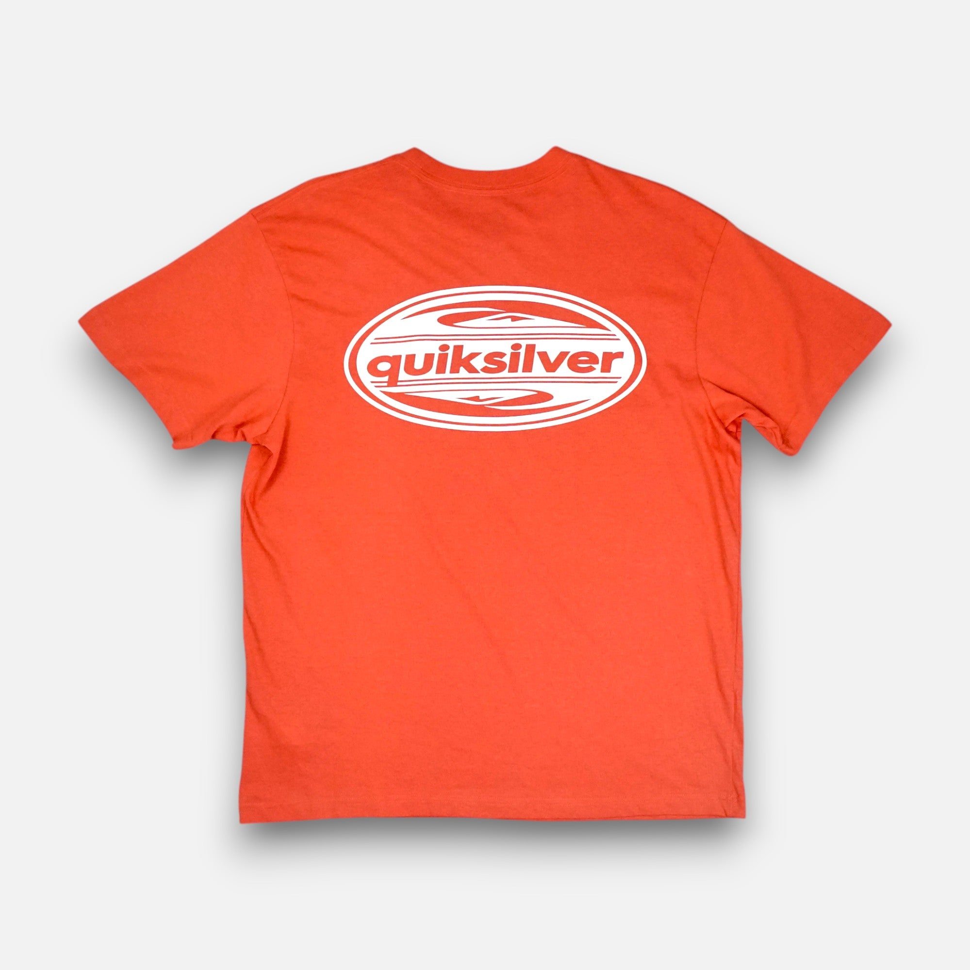 Additional Details: Burnt orange cotton t-shirt, ribbed crew neck, Quiksilver logo print on chest and large oval logo print on back, relaxed fit, brand tag on side seam.